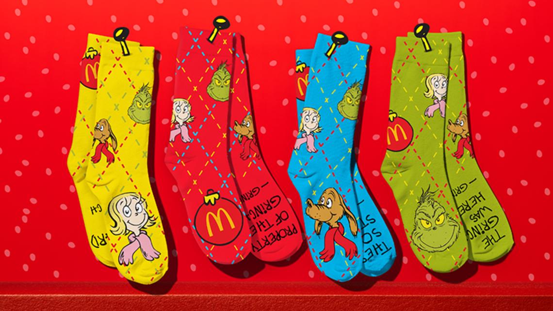 The meal also includes festive socks, available in four colors, and littered with Grinch messages about the holiday season. The socks feature images of the Grinch, his dog, Max, and Cindy Lou Who.